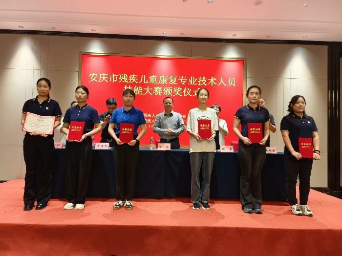 大赛以“精准康复·专业赋能——以赛促建护航残疾儿童成长”为主题,聚焦儿童康复核心岗位需求,设置“运动与感知觉”“言语语言”“社会参与能力”3个竞赛项目,涵盖理论考核与实操竞技两大环节。经过两天的激烈角逐,安庆市残疾人康复中心获“团体一等奖”,宜秀区残联、      怀宁县残联获“团体二等奖”,安庆市社会(儿童)福利院、  潜山市残联等单位分获“团体三等奖”“优秀组织奖”。刘萤萤、曹心玲、洪凤3名选手获“个人一等奖”,高柔敏等5 名选手获“个人二等奖”,张结男等选手分获“个人三等奖”“个人优秀奖”。