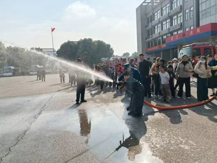 随后,消防员们为学生们带来了精彩的技能展示。如何使用灭火器、如何使用消防水枪。消防员们熟练而又迅速的动作,赢得了学生们阵阵惊叹和掌声。在展示过程中,消防员还邀请了部分学生上台,在他们的指导下体验如何使用消防水枪,虽然消防水枪对于孩子们来说有些沉重,但他们依然兴奋不已,努力模仿着消防员的动作,感受这份特殊的责任与使命。