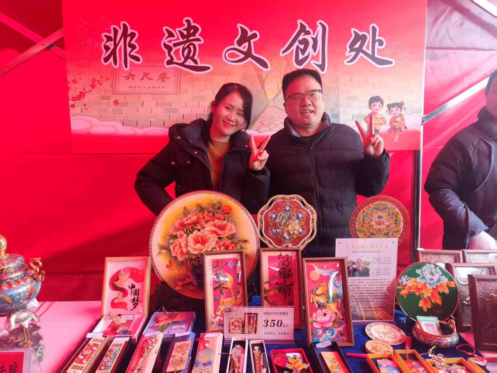 在非遗市集区域,桐城市听障非遗传承人胡俊、吴龙娟携掐丝珐琅挂件、摆件等作品惊艳亮相,件件工艺精湛、匠心独运,又将六尺巷等标志性桐城文化元素巧思融入文创作品,让传统技艺与地方文脉相映成趣,吸引了众多游客驻足观赏购买。夫妻二人同为听力言语残疾人,他们凭借无言的默契合作,潜心创作掐丝珐琅工艺品,双双获评桐城市“县级非物质文化遗产项目掐丝珐琅技艺”的代表性传承人,胡俊还在“安庆市第二届残疾人网络主播暨职业技能展示大赛”中获职业技能展示优秀奖。此次展示不仅丰富了活动的文化内涵,更传递出了残疾人“身残志坚、匠心筑梦”的精神力量,为桐城非遗传承注入了鲜活动能。